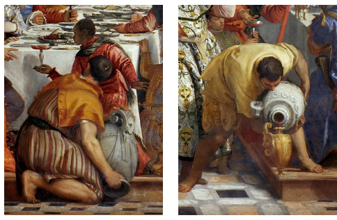 不過,新郎和新娘在哪裡?有趣的是,畫家將他們放在左邊角落。當侍酒師正在獻出耶穌用水所變的酒給新郎。但與此同時,一對新人旁有對夫婦正在問他們關於這些新酒的由來。這對新人的表情彷彿表示他們也不明所以。