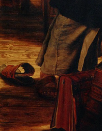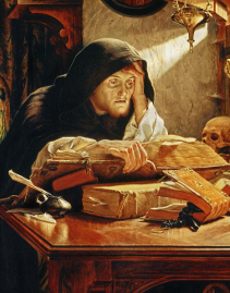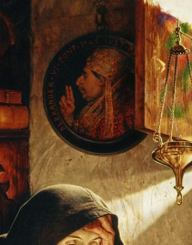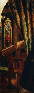 從左邊背景隱約看到教堂的玻璃窗,以及祈禱跪墊和經書架,在書架上還有聖經和公禱書。這些都是修士平日進行聚會的地方和工具。可見這裡就是修道院。