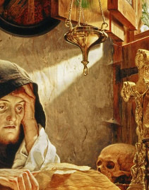 讓我們仔細看馬丁路德的面容,當刻他木無表情,厚厚的眼袋正好反映他被罪疚感所折騰,當他用左手托托著自己的頭時,又呈現一個充滿煩惱和疑惑的樣子。