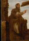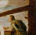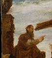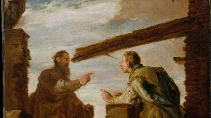 讓我們將焦點放在左邊、留著鬍鬚的老人身上。他坐在樓梯的最高處,舉起右手,用食指指向右邊的年輕人。