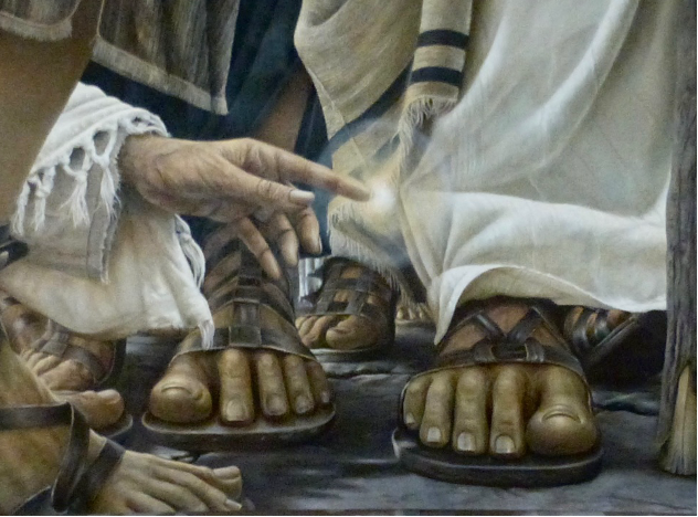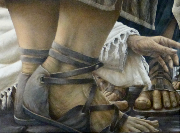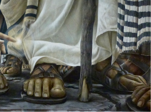 在這幅畫當中,你可能會先被左邊和你最接近的雙足所吸引,畫家很細膩地將一雙腳紋理全畫出來。