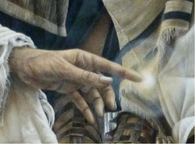 這位患病的婦人為要得到醫治,她排除萬難,就算受人擁擠也要穿過去,勇敢地伸手一摸。結果神蹟出現了!畫中的一點光代表著神的能力要醫治她的疾病。