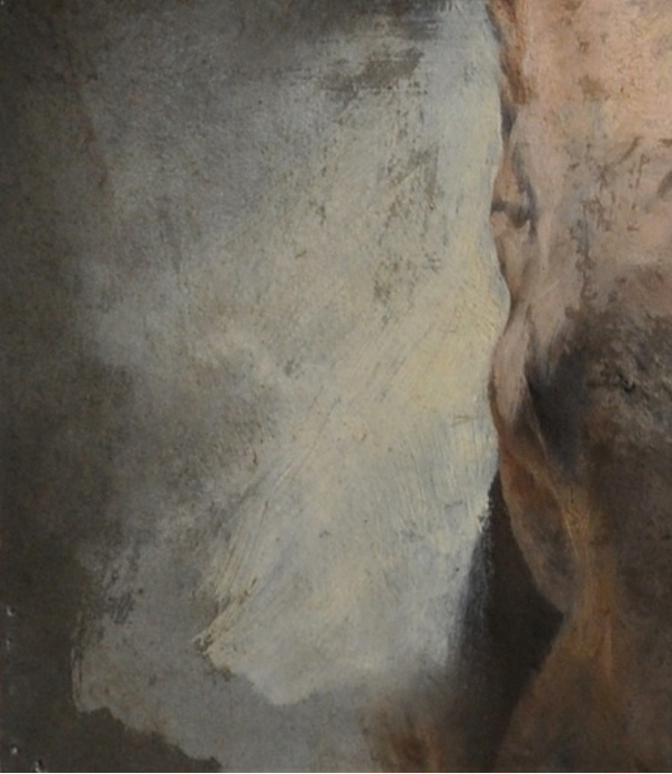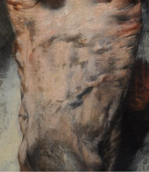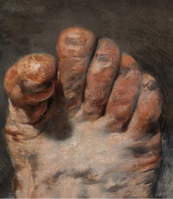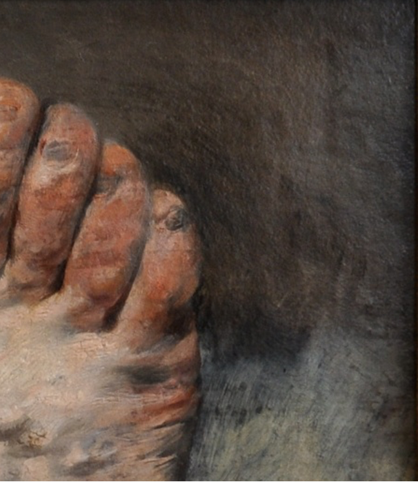但在腳背上,我們亦可見到一塊塊和背景顏色相近的灰色污漬。那究竟是畫家作畫的顏料不小心染在腳上,還是畫家受灰塵污染所致,我們不得而知。