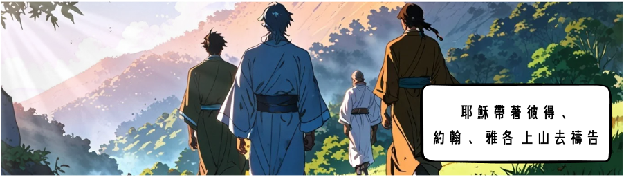 請想像你是其中一位門徒,跟着耶穌上山去禱告。請嘗試感受一下,和煦的陽光照射着你們,微風輕輕吹過,一邊跟著耶穌走,一邊看看山路旁邊有很多花草樹木,山上的自然景色令你陶醉。你和另外兩位門徒是耶穌特別揀選可跟祂上山的,當你走在耶穌的背後,看着祂的身影,你有什麼心情呢?