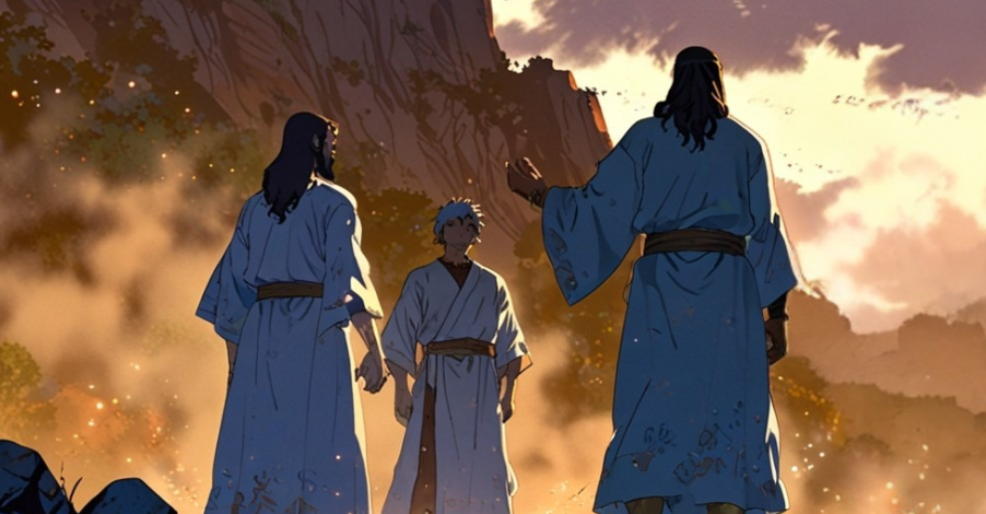 耶穌的身旁多了兩位器宇軒昂的人物,當你清醒過來後,你仔細聆聽他們三位談話的內容,從談話的內容中,你發現這兩位的其中一位就是舊約律法的代表—摩西,另一位就是舊約先知的代表—以利亞!能親眼看見兩位在聖經中舉足輕重的大人物,並看見耶穌的榮耀,你有何感受呢?請仔細觀看耶穌的面容,並靜靜地聆聽他們三人的談話。