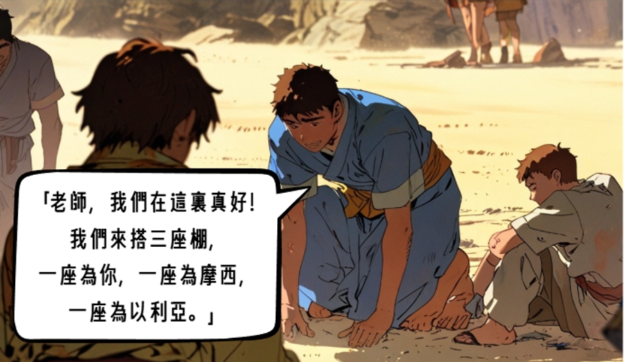 他們三人談論的好像是關於耶穌將要在耶路撒冷受苦、受死,成就救贖的事情。你聽不明白,為何這位榮耀的主要受苦?但你對於他們談論的內容沒有多想,反正聽不明白,偉人說話都是玄妙的,不如說點別的。因為這時刻實在太美好了,你想留在這榮耀當中,所以你對耶穌說:「夫子,我們在這裏真好! 可以搭三座棚,一座為你,一座為摩西,一座為以利亞。」