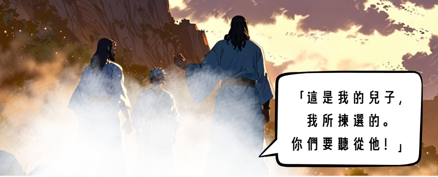 你滿心以為這是一個聰明絕頂的提議,但卻沒有想到就在這時候,有一朵雲彩來遮蓋着你所有人。你進入了雲彩中,眼前白濛濛一片,完全看不見其他人,你心中就十分害怕。這時候,雲彩中有聲音出來說: 「這是我的兒子,我所揀選的,你們要聽他。」