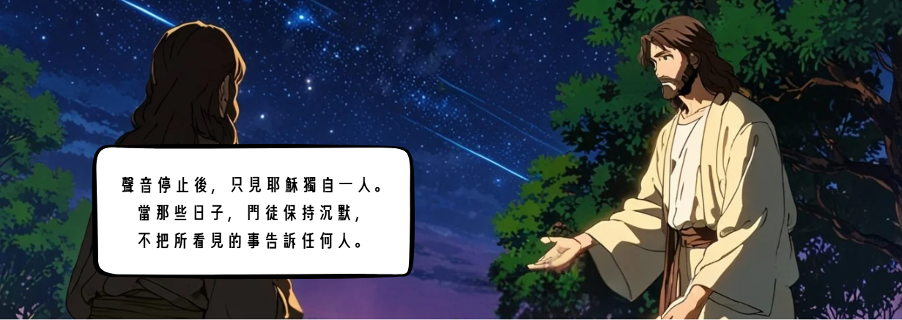 聲音停止了之後,雲彩不見了,摩西和以利亞都不見了,只見耶穌一人在那裏,一切都歸回平靜。