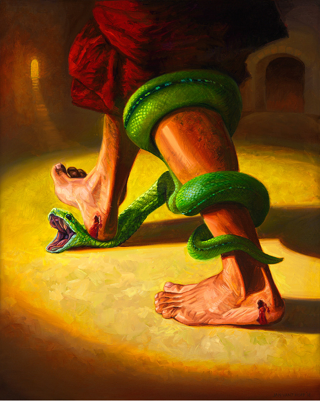 所以,正如畫作所呈現的,蛇緊緊用牠的身體纏繞著人的小腿