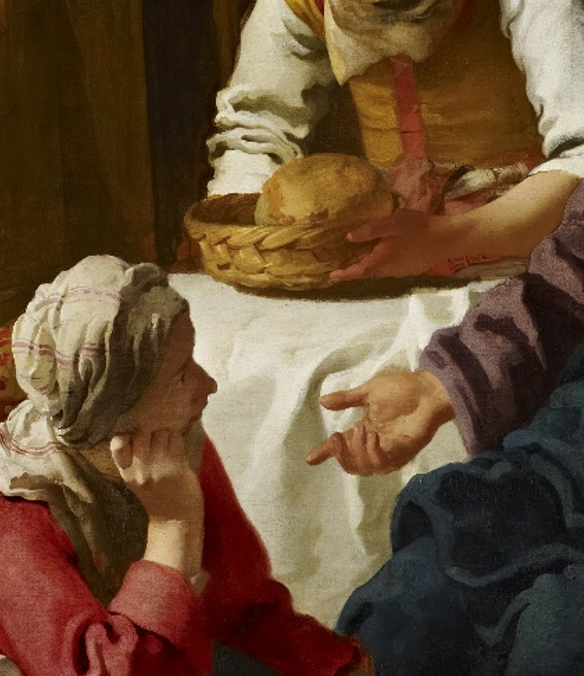 在這幅畫作中,我們可以留意到在上方捧著麵包籃,在餐桌上打點的馬大。她微微躬身,看起來相當操勞。
