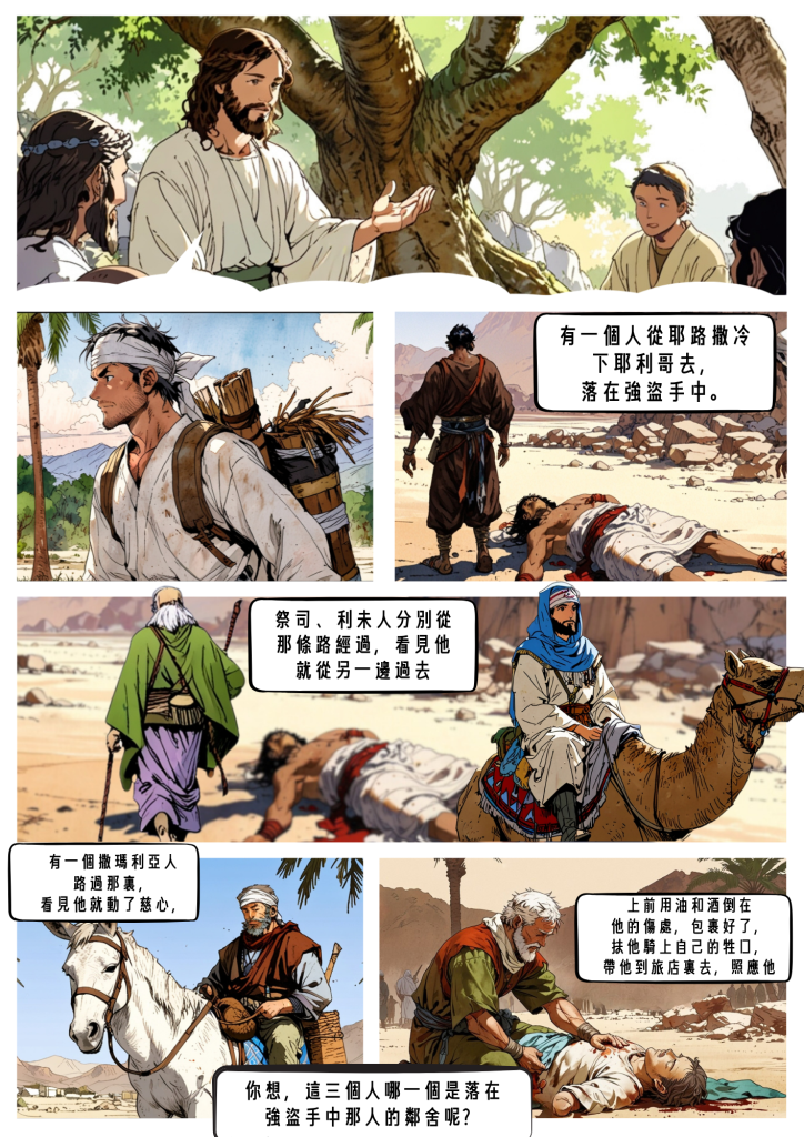 </div?三.耶穌呼召你耶穌講述一個「好撒馬利亞人」故事來回答律法師的提問──「誰是我的鄰舍」,並呼應前文來說明律法總綱「愛神、愛鄰舍如己」的意思。因為撒馬利亞人和猶太人本是世仇,耶穌以這個比喻表達,愛的界限不受民族、宗教、身份、文化所限。真正的鄰舍,是願意付出行動關懷別人的人。
