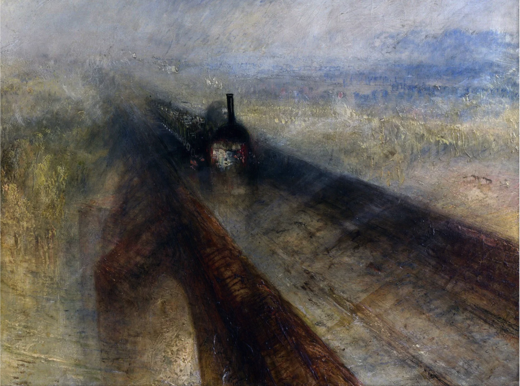 https://upload.wikimedia.org/wikipedia/commons/thumb/3/35/Rain_Steam_and_Speed_the_Great_Western_Railway.jpg/3840px-Rain_Steam_and_Speed_the_Great_Western_Railway.jpg弟兄姊妹,今日讓我們觀賞十八世紀英國畫家泰納在1844年所畫的名畫《雨、蒸氣和速度》。